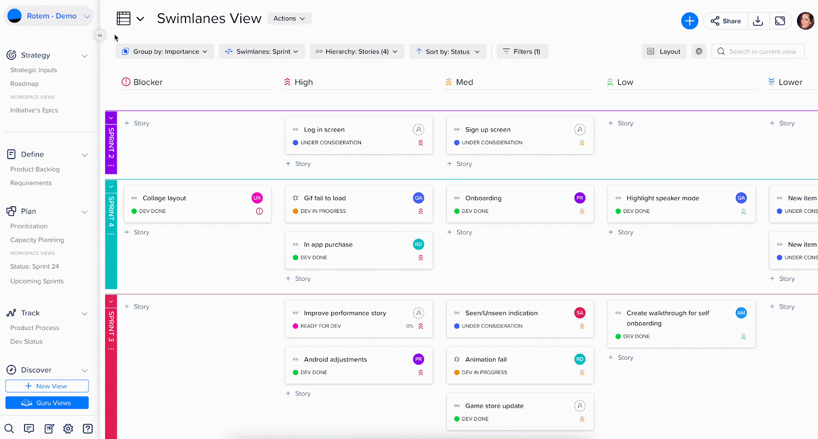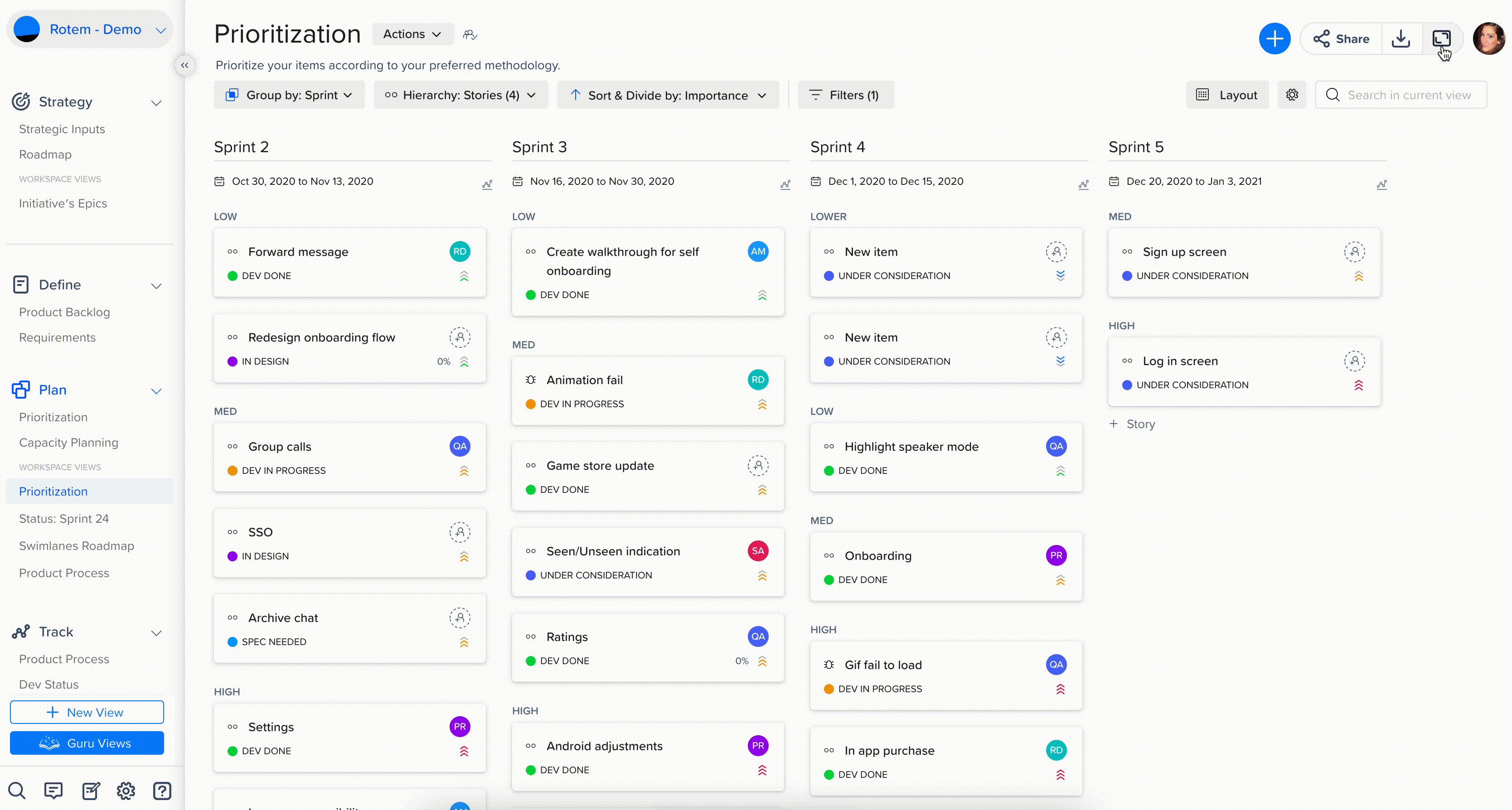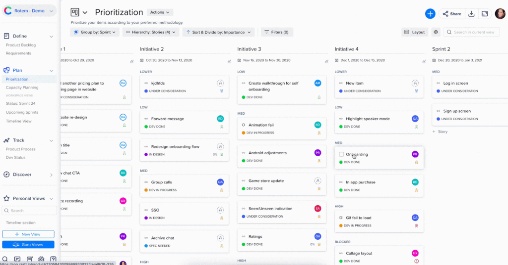 So we recently released a Sprint Panel — a designated area just for sprints. You can now view and edit your sprint’s contents using whichever visual framework you choose, whether that’s work by team, product or dev status, a dependencies view, or one of craft.io’s predefined prioritization frameworks.