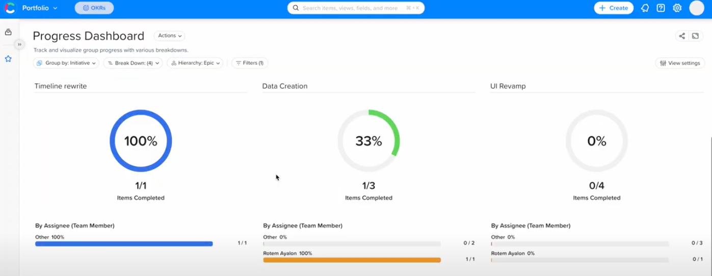 With the progress dashboard’s flexible views and data filtering options, you can quickly and easily spot areas of your product organization that are falling behind in their assigned work.