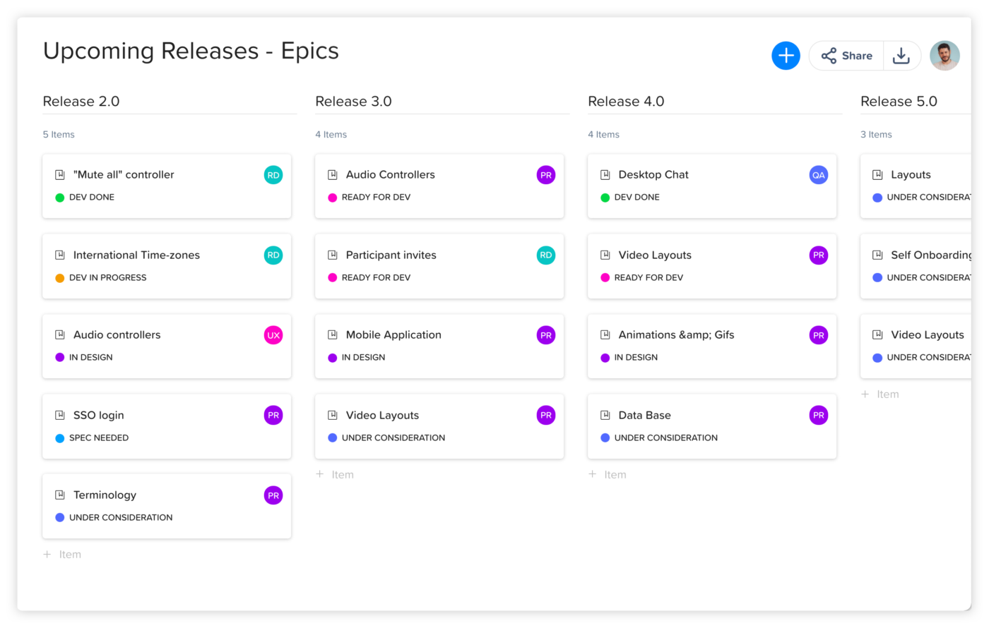 With craft.io’s roadmapping, for example, you can slice and dice your content to view upcoming work according to whichever data sets you need. You can view your team’s work broken out by timelines, releases, specific areas of the product (or specific products in your portfolio), priority levels, current status — and any other data you need to review or present to stakeholders.
