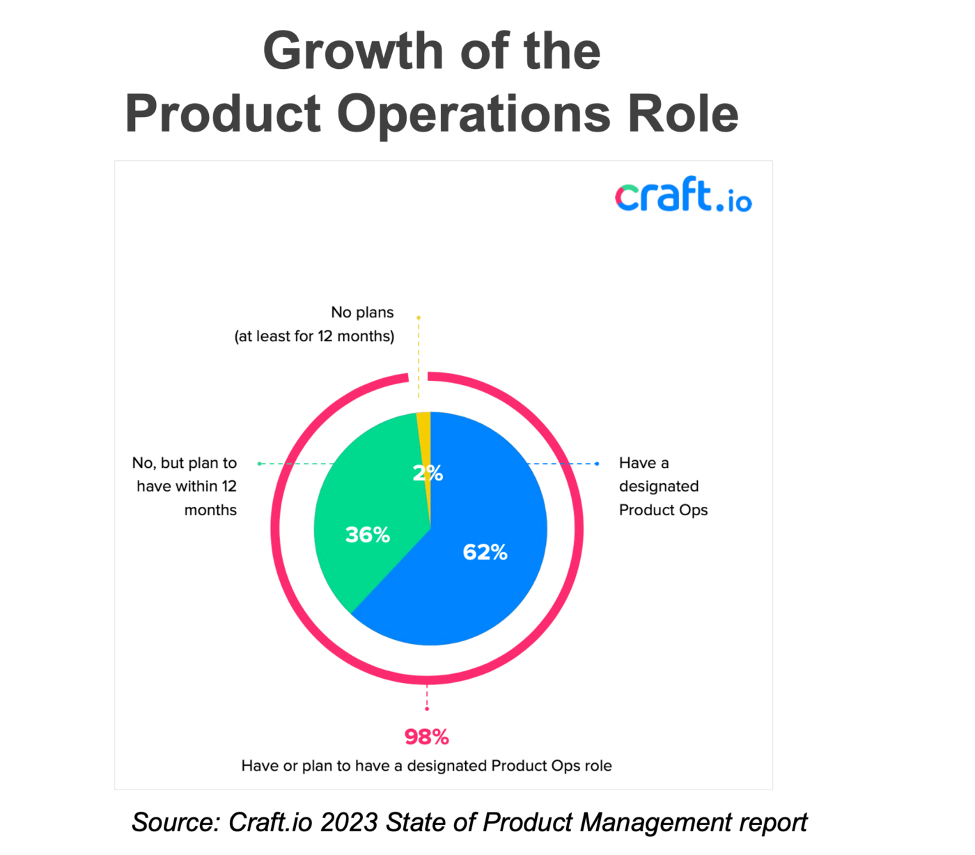 Here’s one more datapoint showing the demand for product ops roles. When we surveyed hundreds Product Managers and Product Leaders for our craft.io 2023 State of Product Management report, we found that nearly every one of them – 98% – had either already created a product operations position or were planning to hire the role in the coming year.