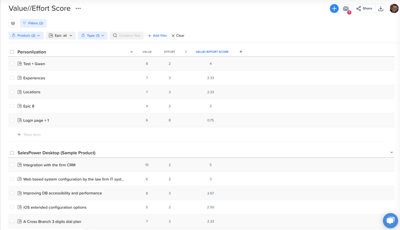 Once the final value/effort score is automatically calculated in craft.io, Features can be easily sorted by ascending/descending order.