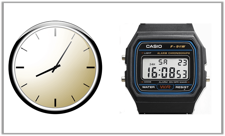 My favorite example is that of analog watch Vs. digital watch. Indulge yourself this short experiment: take a quick glance at each of the watches and try to recall what time it says.