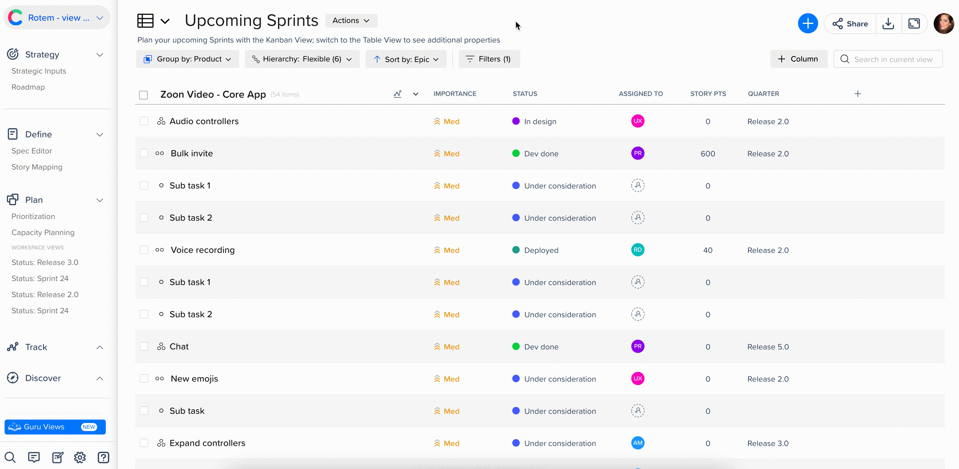 Epics (major, strategic areas of the product)