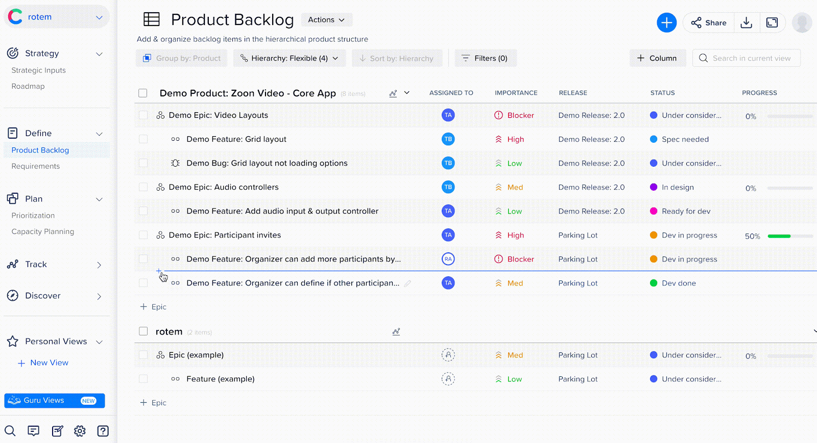 - The ability to organize your backlog into logical hierarchy to support all levels of your product structure.