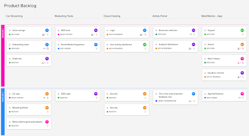 You can also view your backlog using the familiar swimlane view, where you can set the swimlanes to represent any category you choose: teams, initiatives, objectives, etc. And again, if you use the craft.io backlog functionality depicted here to drag and drop an item to a different swimlane, that update will populate across all backlog views.