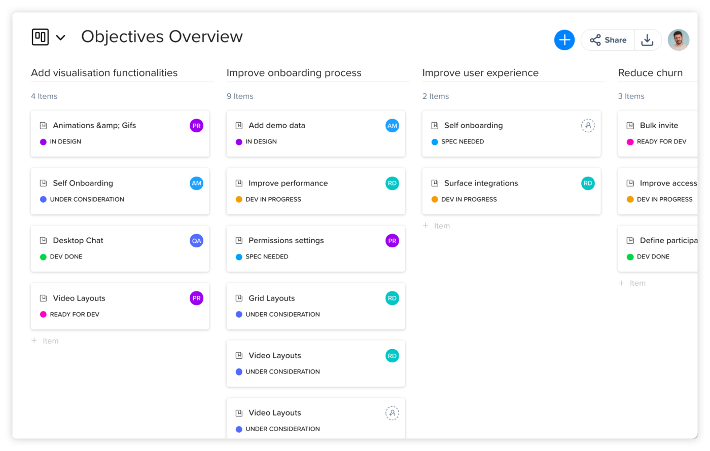 Make sure you’re developing items that support your — and your company’s — objectives with the Objectives Overview View. Benefit from a high-level view of your strategy broken down into objectives and quickly understand how the items your teams are developing support each one. Shift priorities to focus on different objectives according to the changing needs of your organization and your available resources.